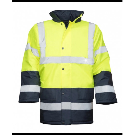 Veste doublure 100% polyester 60g, isolation thermique 100% polyester 170G, tissu intérieur 100% polyester, bandes réfléchissantes 2 horizontales, 2 verticales, 2 sur les manches, 3 poches, capuche amovibles, poignets en tricot